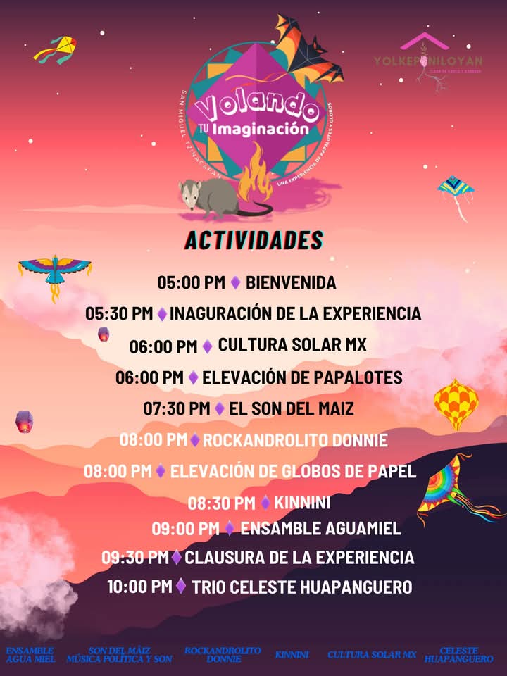 Actividades viernes 4 de Abril: Inauguración, elevación de papalotes y globos, y conciertos de Cultura Solar, Son del Maíz, Rockandrolito Donnie, Kinnini, Ensamble Aguamiel,Trio Celeste de Huapango, Clausura de experiencia.