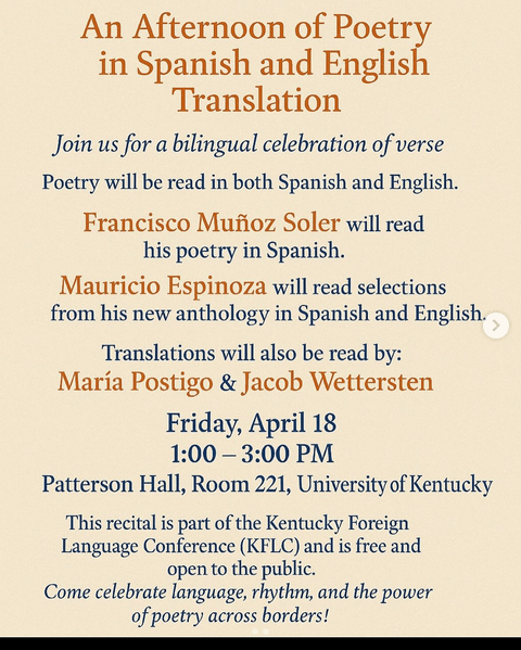 La poesía cruza idiomas, culturas y geografías. El próximo viernes 18 de abril, el poeta costarricense Mauricio Espinoza —autor clave de la diáspora latinoamericana en Estados Unidos y parte de la familia Ultramarina— participará en una lectura bilingüe en la University of Kentucky como parte del Kentucky Foreign Language Conference (KFLC).