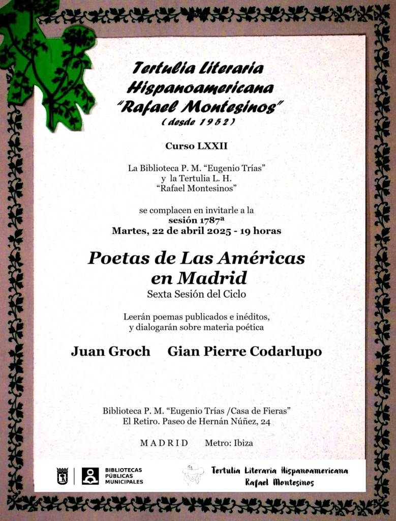 Este martes 22 de abril de 2025, a las 19:00 h, la histórica Tertulia Literaria Hispanoamericana Rafael Montesinos, que desde 1952 ha reunido a poetas de ambos lados del Atlántico, abre sus puertas una vez más a la palabra migrante y viva. En esta ocasión, la sesión 1787ª del ciclo Poetas de las Américas en Madrid contará con la participación del poeta y editor Gian Pierre Codarlupo, quien compartirá su trabajo junto al también autor Juan Groch.