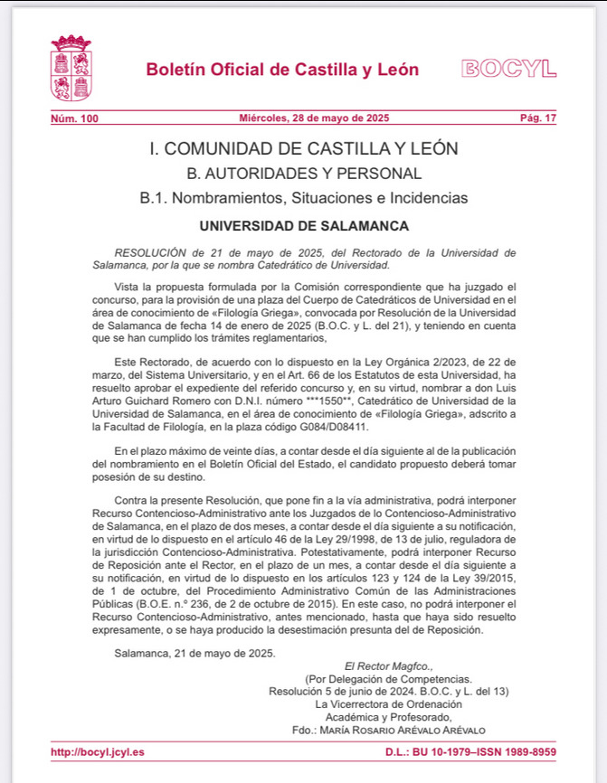 Con enorme alegría, celebramos el nombramiento de Luis Arturo Guichard Romero como Catedrático de Universidad en el área de Filología Griega de la Universidad de Salamanca, tal como recoge el Boletín Oficial de Castilla y León del 28 de mayo de 2025.