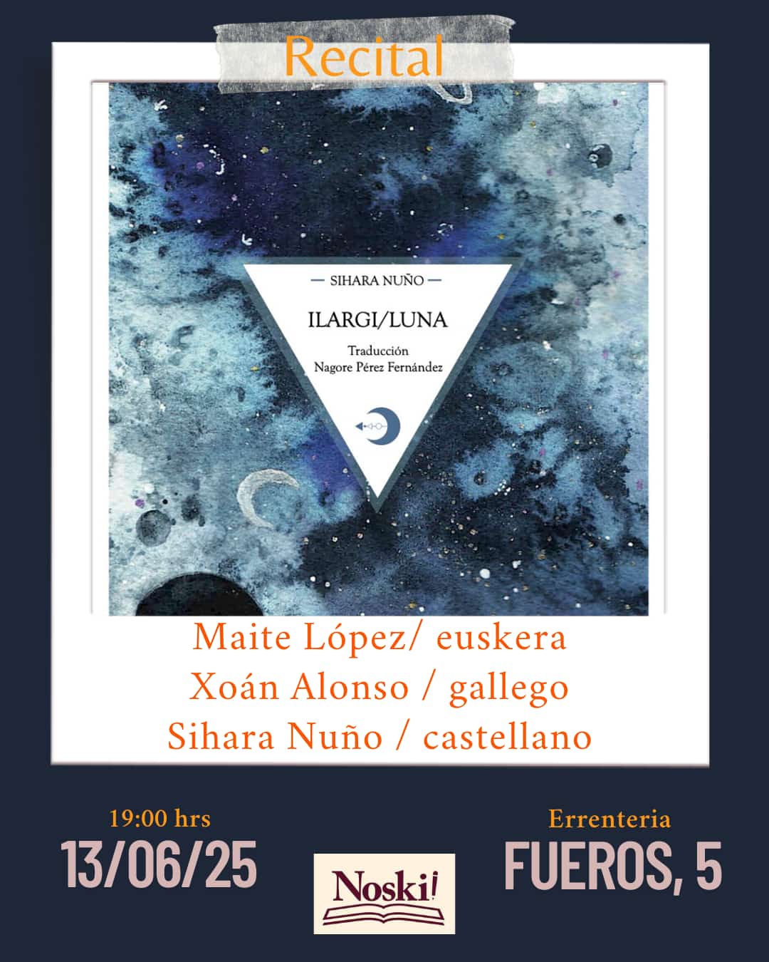 El próximo jueves 13 de junio a las 19:00 h, la librería Noski! Liburudenda, en Errenteria (calle Fueros, 5), acogerá un recital que no solo es literario, sino profundamente simbólico: la presentación en vivo de Ilargi / Luna, de Sihara Nuño, publicado por Editorial Ultramarina C&D.
