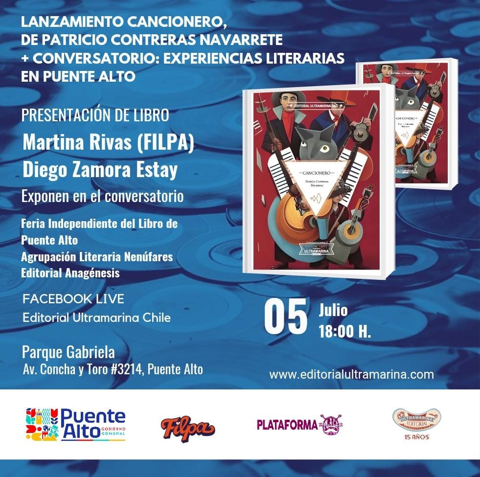 Este sábado 5 de julio, se presenta en Santiago de Chile el libro Cancionero, de Patricio Contreras Navarrete, publicado por Editorial Ultramarina C&D dentro de su colección cartonera.