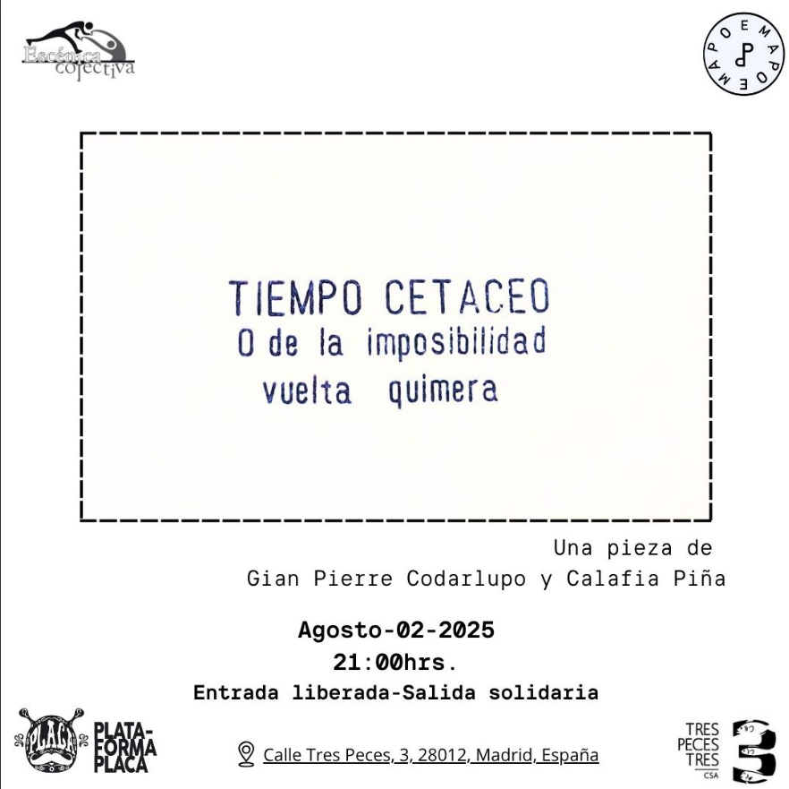 La Plataforma PLACA se complace en anunciar una de las piezas poético-escénicas más singulares del verano: Tiempo Cetáceo. O de la imposibilidad, vuelta, quimera. Una creación de Gian Pierre Codarlupo y Calafia Piña, que se presentará el 2 de agosto de 2025 a las 21:00h en el espacio Tres Peces Tres, en pleno corazón de Lavapiés (Calle Tres Peces, 3, Madrid).