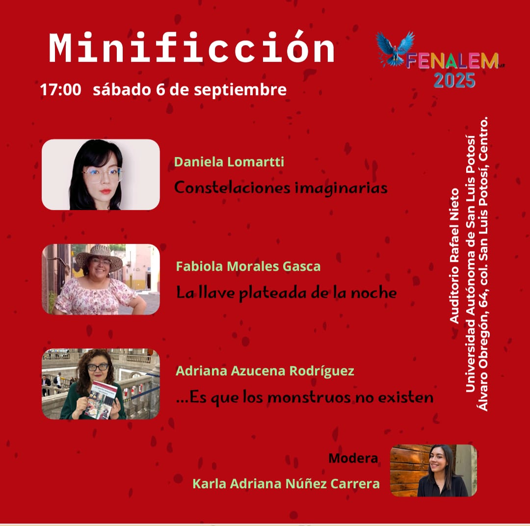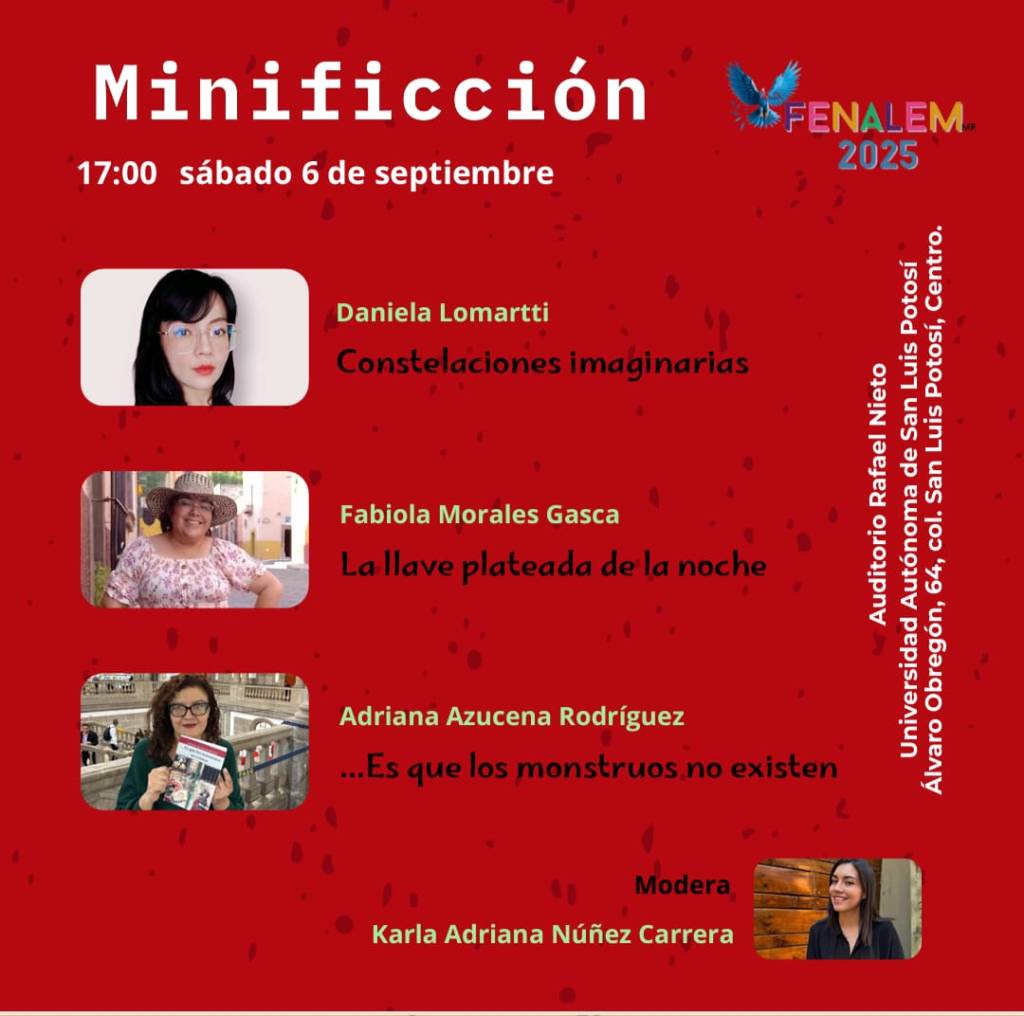 La poeta y narradora Daniela Lomartti presentará su pieza de minificción «Constelaciones imaginarias» el sábado 6 de septiembre a las 17:00 h, en una mesa moderada por Karla Adriana Núñez Carrera. La acompañarán las autoras Fabiola Morales Gasca y Adriana Azucena Rodríguez. La obra de Lomartti, caracterizada por una precisión fulgurante y un lirismo contenido, se inserta en una literatura que indaga lo íntimo y lo misterioso con delicadeza quirúrgica.