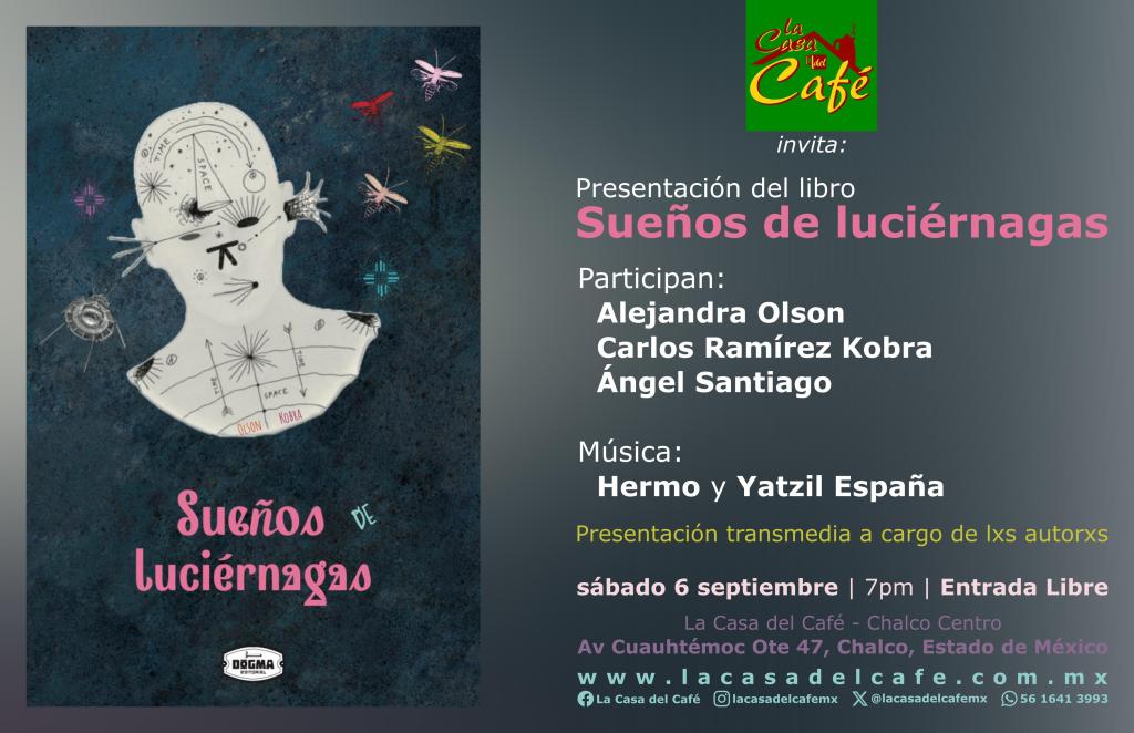 El próximo sábado 6 de septiembre a las 19:00 hrs, se presentará el libro Sueños de luciérnagas en La Casa del Café (Chalco Centro, Estado de México). Con la participación de sus autorxs, Alejandra Olson, Carlos Ramírez Kobra y Ángel Santiago, este evento promete ser mucho más que una simple lectura: será una experiencia poética y sensorial expandida.