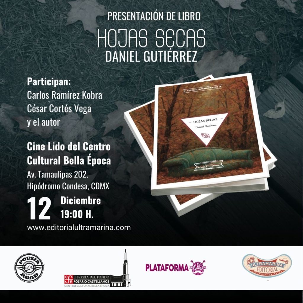 El próximo 12 de diciembre, la Ciudad de México abrirá un espacio de escucha y resonancia poética con la presentación de Hojas secas, el más reciente libro del autor Daniel Gutiérrez, publicado por Editorial Ultramarina Cartonera & Digital.