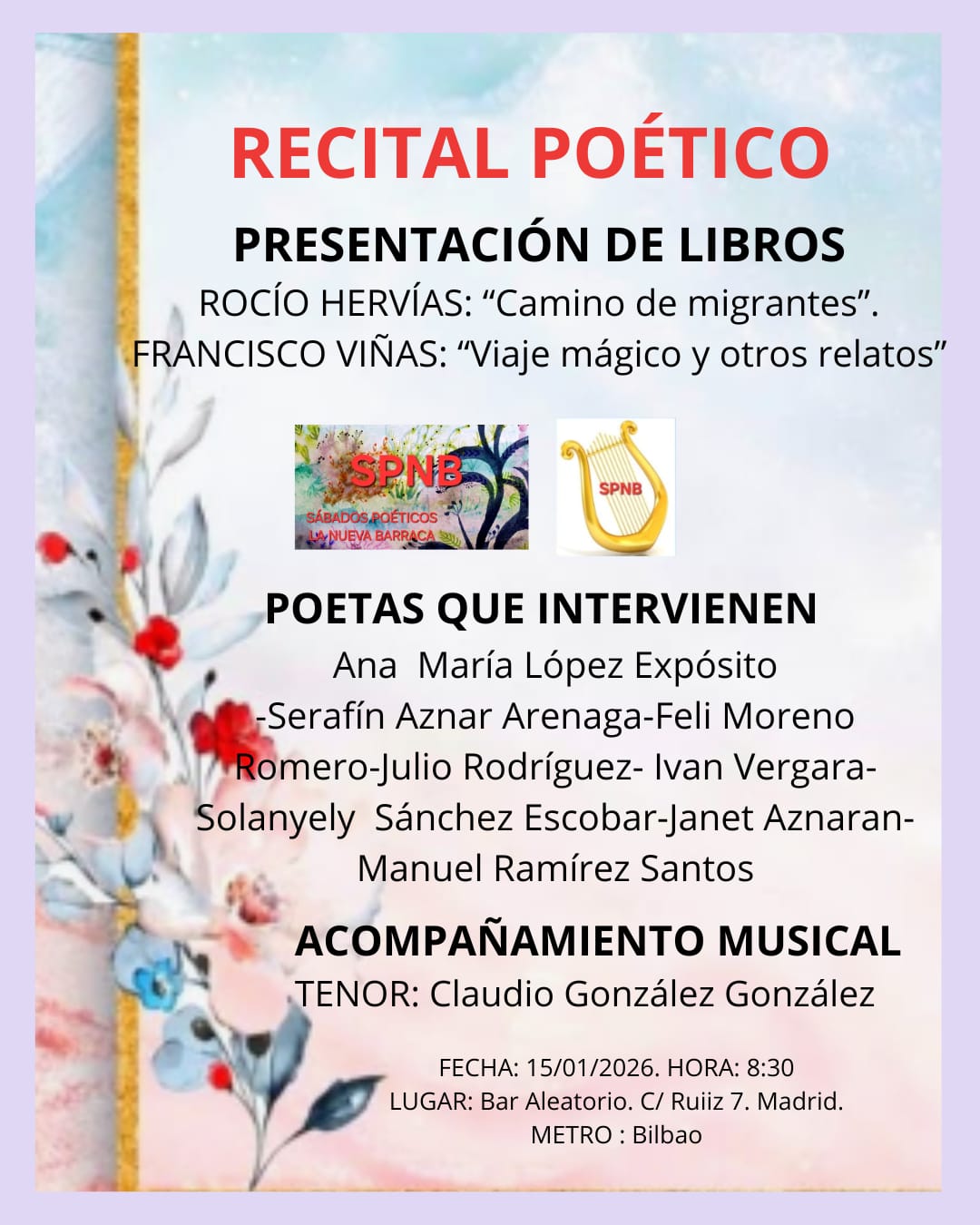 El recital contará con la intervención de las y los poetas Ana María López Expósito, Serafín Aznar Arenaga, Feli Moreno Romero, Julio Rodríguez, Iván Vergara, Solanyely Sánchez Escobar, Janet Aznaran y Manuel Ramírez Santos, conformando un mosaico coral donde cada voz aporta su pulso y su mirada.