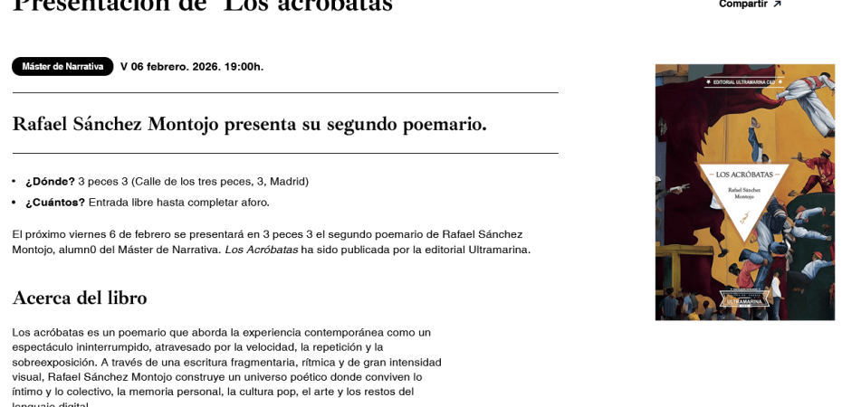 La presentación en 3 peces 3, espacio cultural ubicado en el corazón del barrio de Lavapiés, se perfila como un encuentro para quienes buscan poesía que no adorna, sino que interpela. Un lugar donde la palabra se escucha, se siente y se comparte. Rafael Sánchez Montojo leerá fragmentos del libro y conversará con el público sobre los procesos que dan forma a Los Acróbatas.